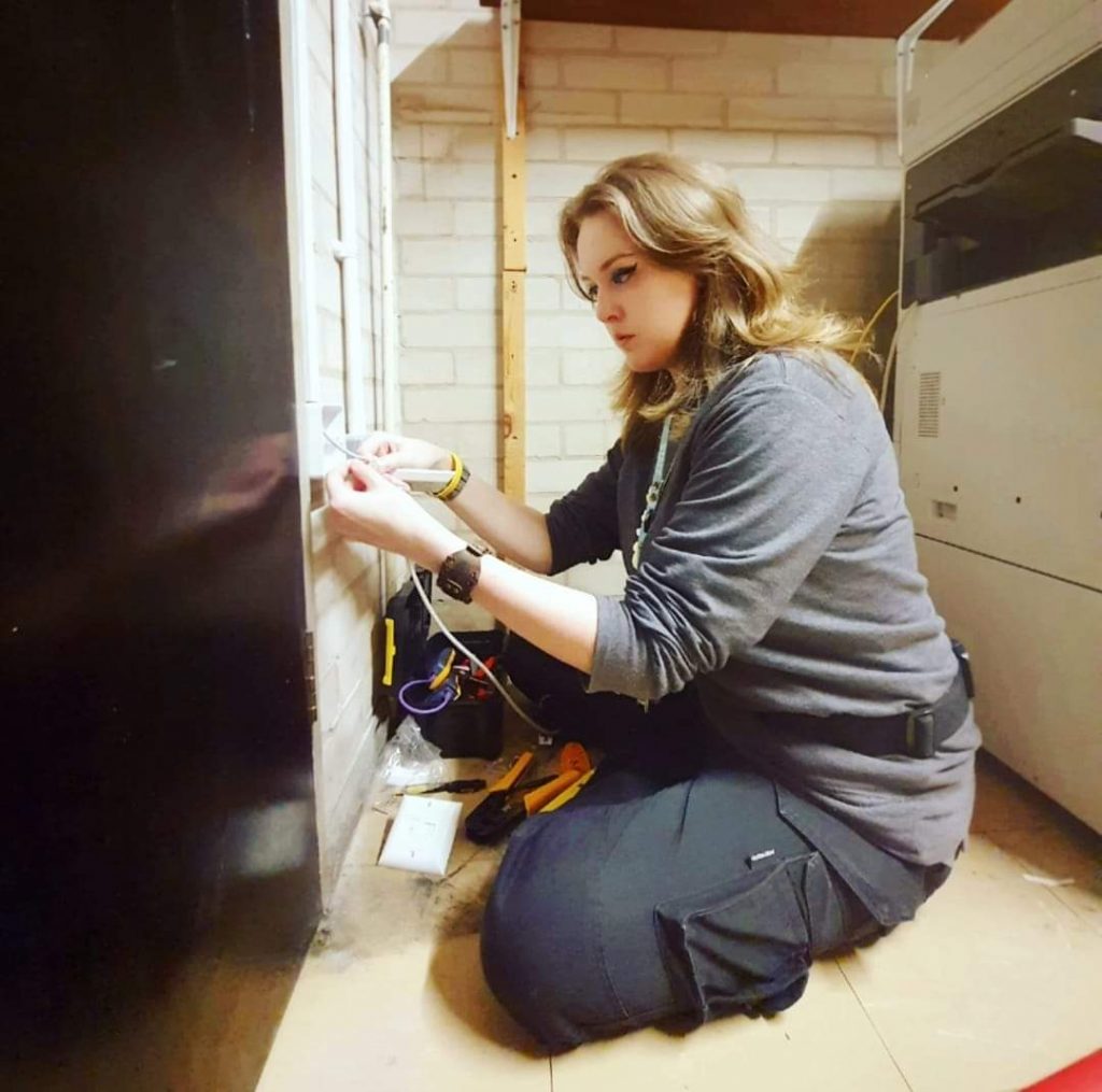Becky doing on-site cabling work